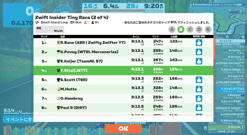 リザルトは4位、ZwiftPowerでは一人抜けて3位になっていました。