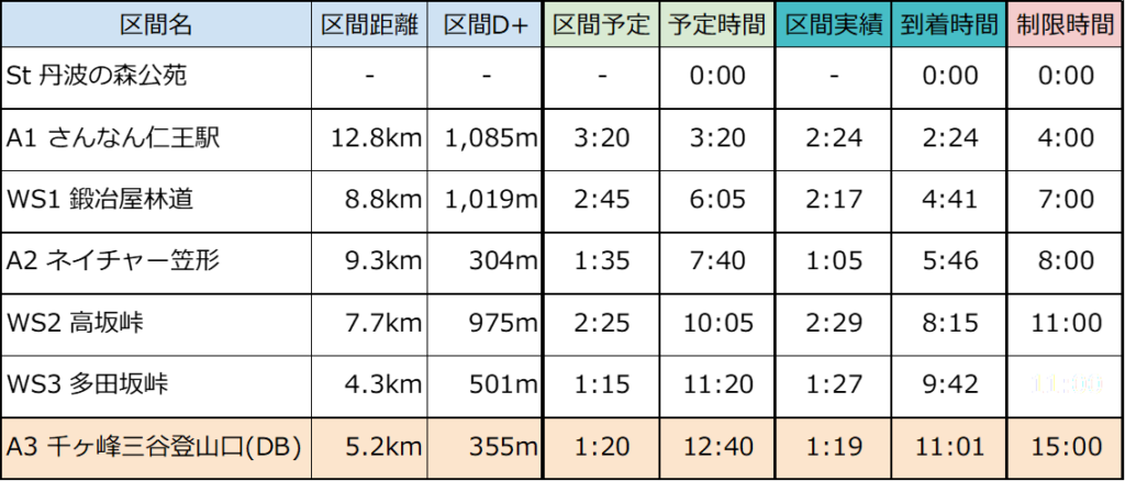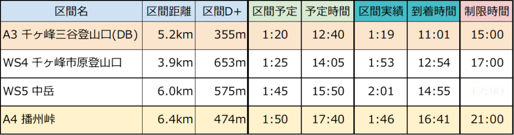 A3のエイドストップが30分と長かったのでそこで貯金を使ってはいますが、ほぼオンタイムでの進行。